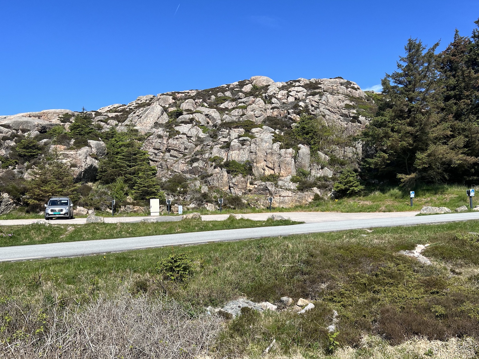 Nach einer kurzen Nacht auf einem freien Stellplatz irgendwo am Rande von Kristiansand nehmen wir unsere 1. Fahretappe auf norwegischem Boden in Angriff. Da wir nach dem letzten Ladestopp in Dänemark noch etwas die Gegend erkundet hatten, reicht die Restkapazität der Batterie nicht mehr ganz aus, um zuerst den südlichsten Punkt Norwegens anzufahren und danach noch den nächsten Superchargerstandort zu erreichen. So entschliessen wir uns, zum ersten Mal auf dieser Reise eine Ladestation eines anderen Anbieters aufzusuchen. Diese ist gleich nach einer Tankstelle platziert und bietet sechzehn Ladesäulen. Sieht alles topmodern aus und ist sogar so konzipiert, dass man auch mit einem Gespann ohne abkuppeln laden kann. Nun kommt der gewichtige Unterschied: Während Ladestandorte von Tesla grundsätzlich mit Plug and Charge funktionieren, muss man hier erstmal eine Ladeapp starten. Bei der ersten gespeicherten App kann ich mich an die Zugangsdaten nicht mehr erinnern, die zweite App kennt diesen Standort nicht (obwohl es bei allen Apps immer heisst, dass man an x-zehntausend Standorten in ganz Europa damit laden könnte). Da hier, wie bei uns leider auch meistens, Kartenzahlung nicht möglich ist (so ein Kartenterminal muss ja ein Vermögen kosten), bin ich etwas unschlüssig was ich jetzt machen soll, bis mir wieder einfällt, dass Ladesäulen normalerweise mit einem QR-Code versehen sind. So ist es auch hier. Handy draufhalten und flugs lande ich auf der Webseite des Betreibers (in norwegischer Sprache). Nach der Eingabe meiner Daten (inklusive derjenigen der Kreditkarte) kann der Ladevorgang endlich starten. Alles in allem hat es rund 20 Minuten gedauert (am Supercharger benötigen wir für die Vorbereitung kaum mehr als 20 Sekunden). Kurze Zeit später können wir unsere Reise fortsetzen.