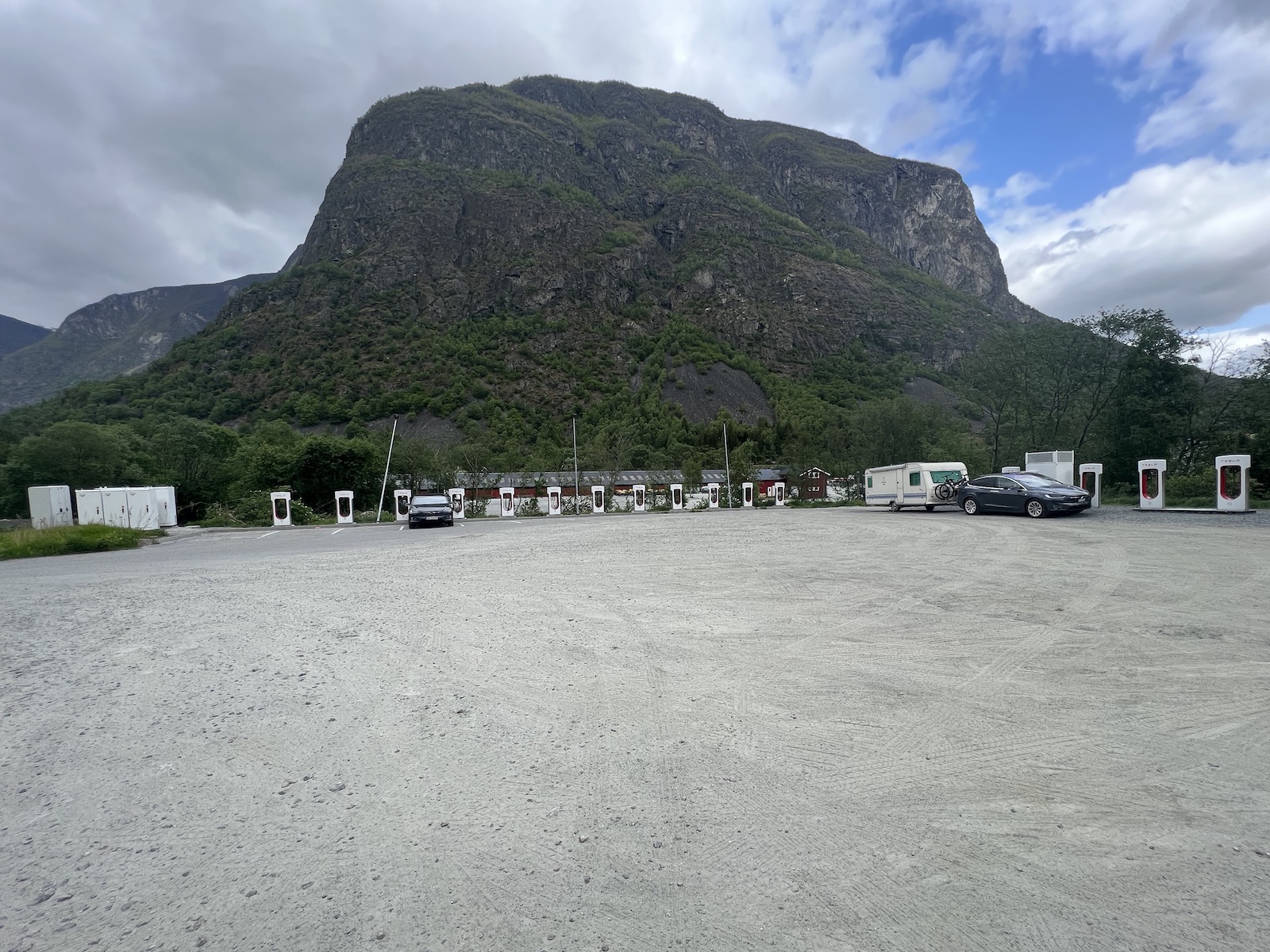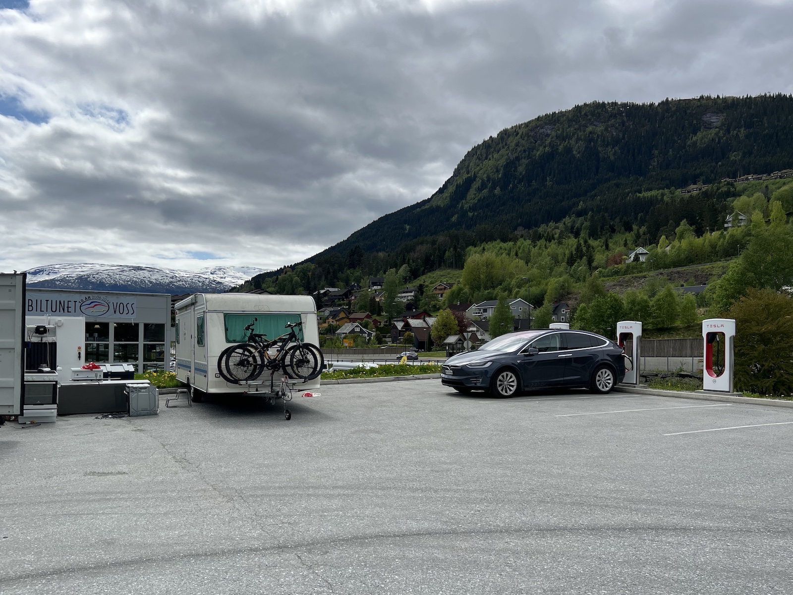 18. Ladestopp am Superchargerstandort Voss (ausnahmsweise Wohnwagen abkuppeln müssen) -