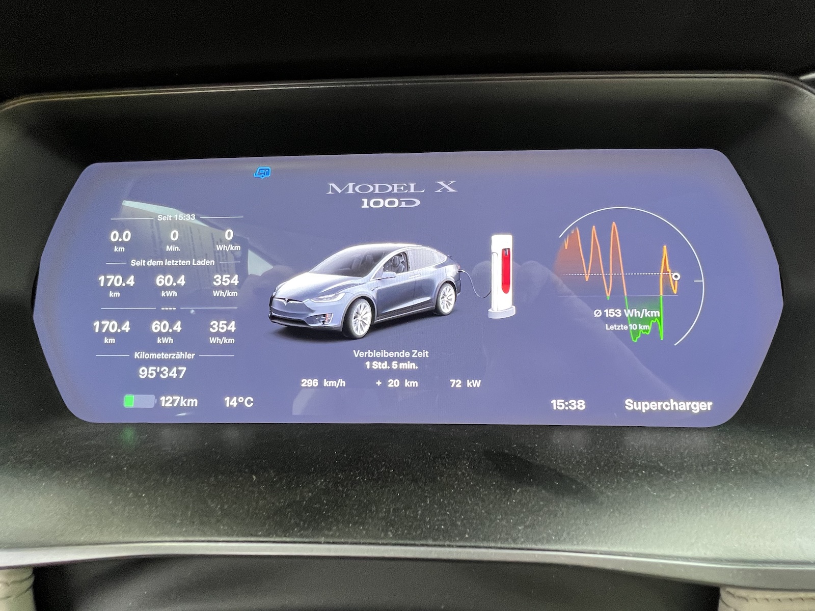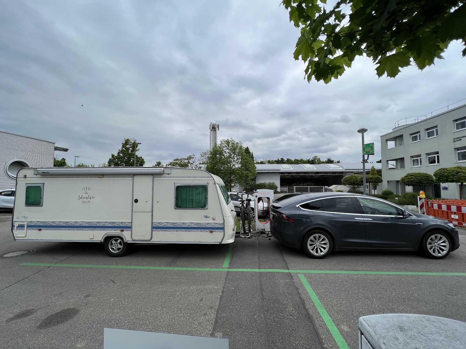Die Verkehrsdichte ist zwar zeitweise hoch, aber in unserer Richtung zum Glück ohne Staus. Wir kommen gut voran (deutlich besser als in der Planungsphase angenommen). Der Tesla berechnet aufgrund des Verbrauchs automatisch und fortlaufend den idealen Superchargerladeort. Diese befinden sich nicht direkt an der Autobahn, sondern maximal 3 km entfernt. Meistens sind sie auf einem Autohof angesiedelt. Nach rund 170 km Fahrt und 107 km Restreichweite führt uns das Navi zielsicher zum 1. Ladestopp bei Leonberg. Obwohl die Station etwas versteckt liegt, finden wir sie auf Anhieb. Es sind aber nicht nur zwei, drei oder vier Ladesäulen, sondern gleich deren 20! Und auf der gegenüberliegenden Strassenseite entdecken wir beim Gassigehen einen weiteren Standort mit sicherlich nochmals 16 Ladesäulen. Obwohl der Standort gut besucht ist, können wir (nach dem Abkoppeln des Wohnwagens) sofort an einer Säule laden. Später wird sich noch herausstellen, dass mehr oder weniger alle Standorte mit mindestens 16 Ladesäulen, manchmal auch deutlich mehr ausgestattet sind. An keinem einzigen dieser Standorte gab es eine Warteschlange.